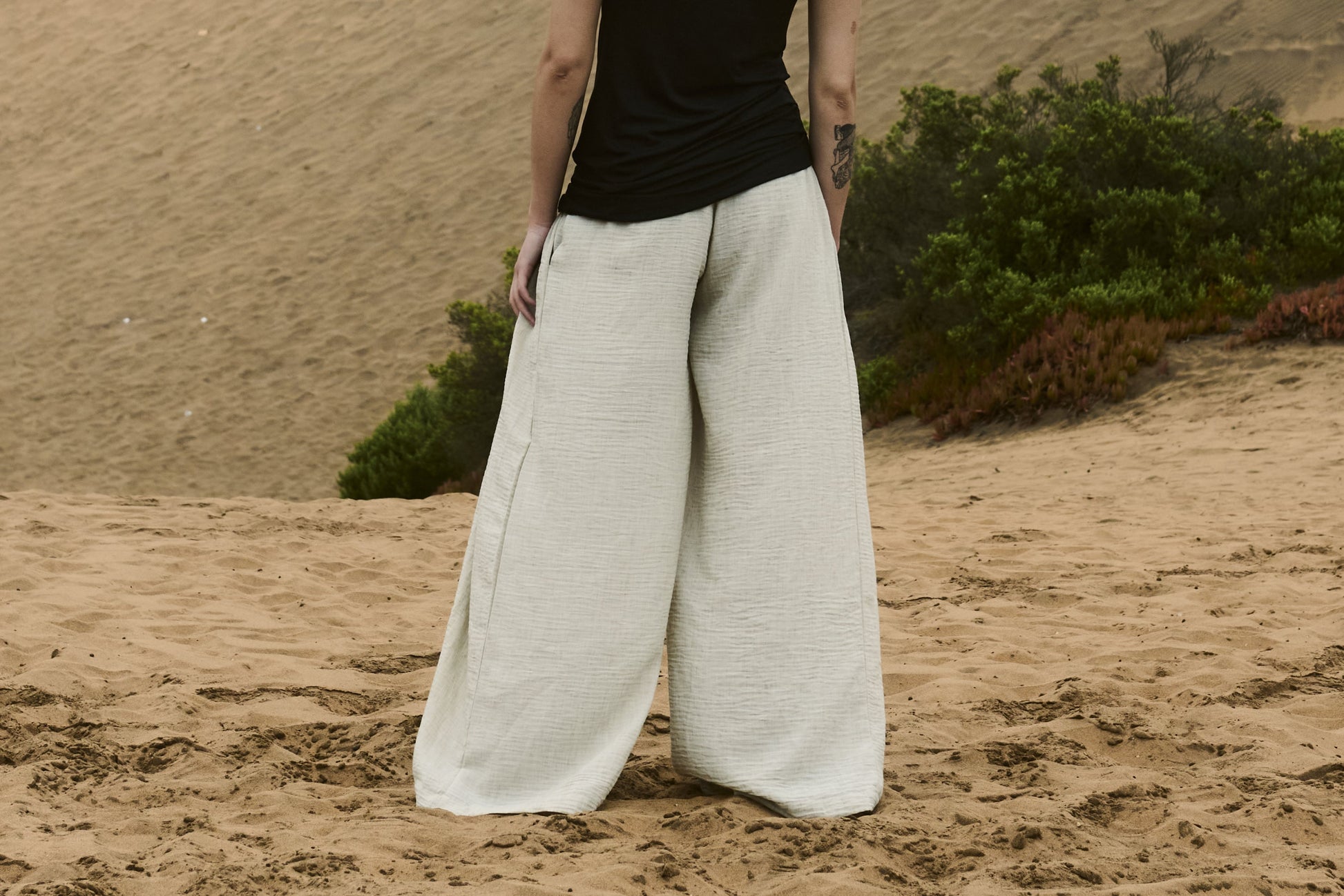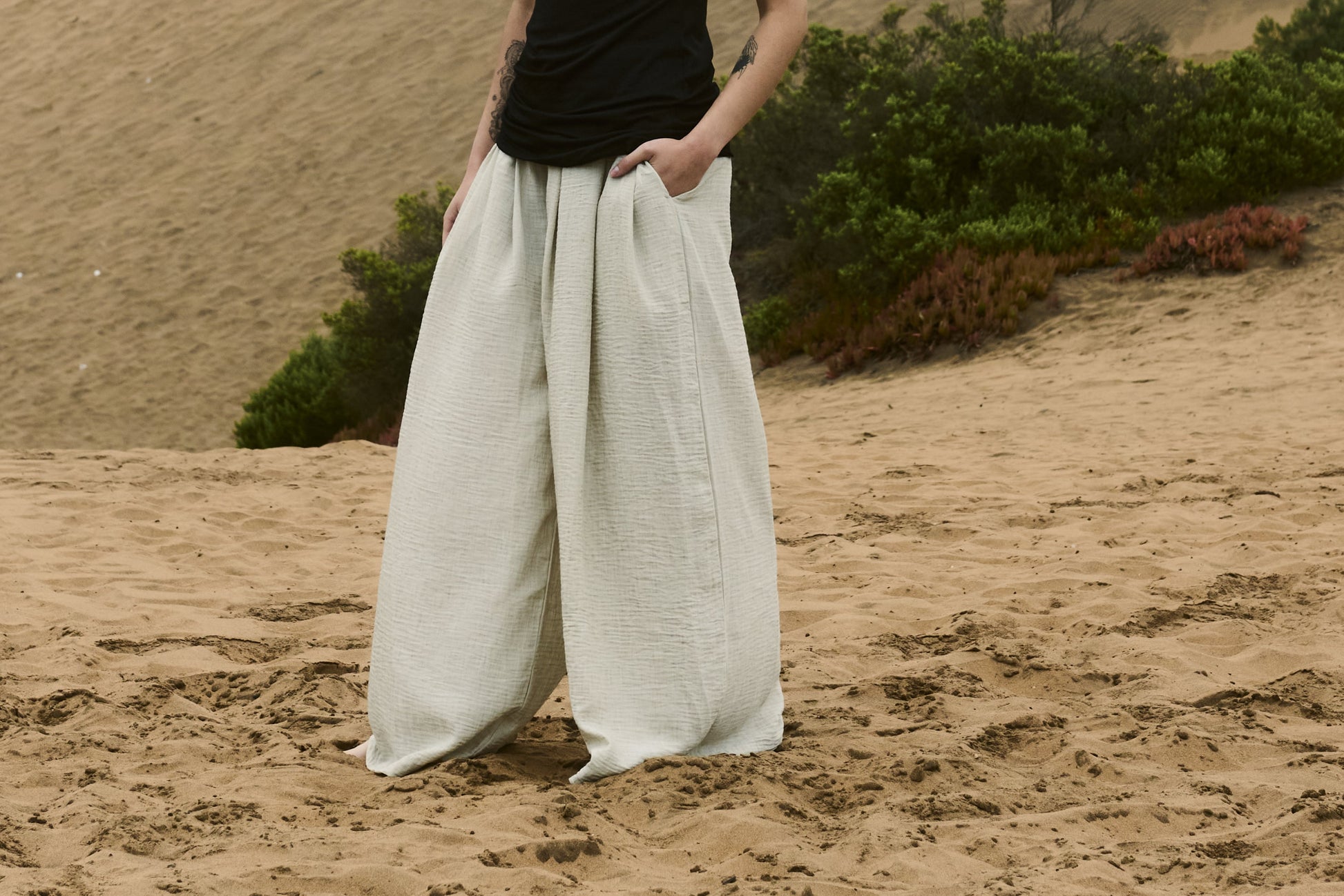 Confeccionados en un tejido de poliéster de alta calidad, con textura similar al lino pero más resistente y uy delgada, ideal para el verano, ofrecen frescura y una caída impecable. Su diseño de tiro alto estiliza la figura, mientras los pliegues frontales añaden volumen y movimiento a partir de la cadera.