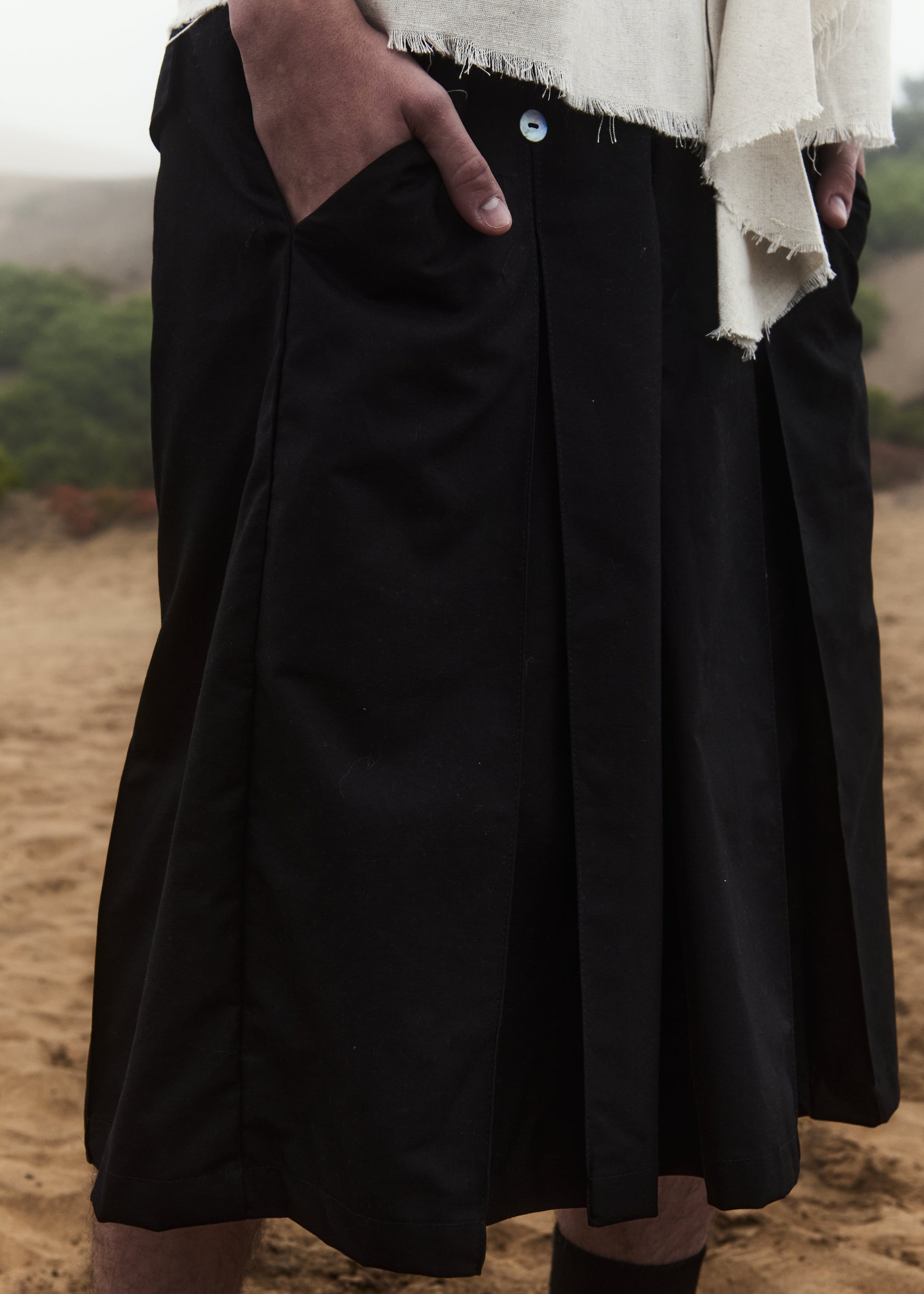 Pensado para moverse con libertad sin perder estructura. Este short de KAZE equilibra comodidad y presencia: una silueta limpia, con pliegues que le dan volumen controlado y una caída elegante. Ideal para días cálidos, cuando quieres un look ligero pero con intención.